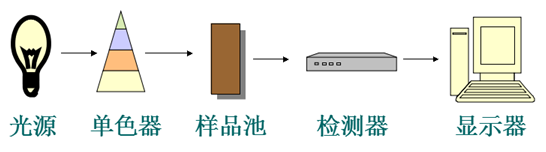 分光光度計主要由光源、單色器(分光鏡)、吸收池、檢測器和顯示器五大部分組成。